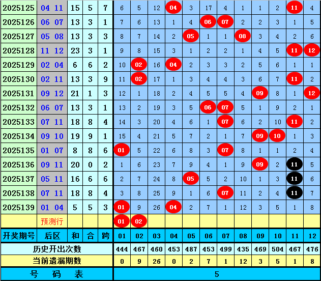 前区三号球上期开出1路奖号22,最近10期前区三号球出现界限在09-25区段,其中012路号码分别开出3个、6个和1,本期前区三号球扫视出现2路号码,精选一码11。