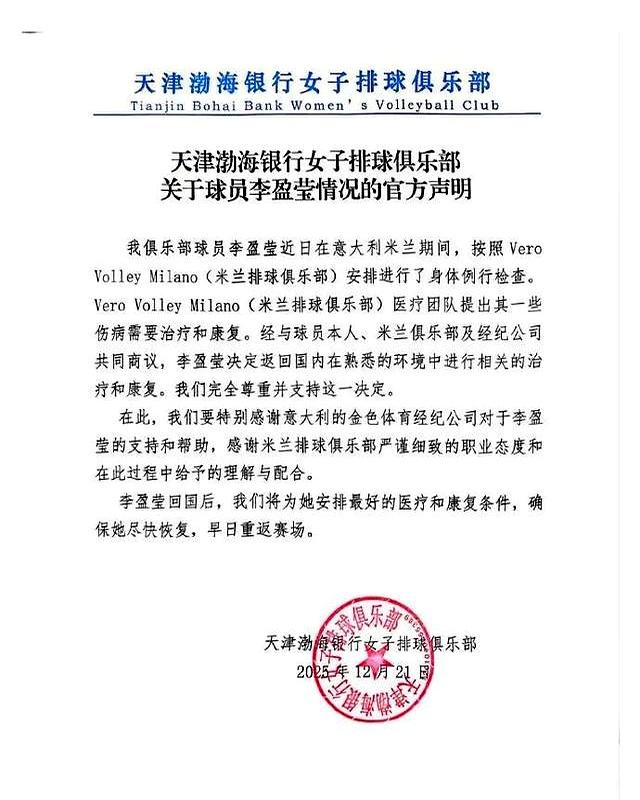 12月21日,天津渤海银行女排发出官方声明:李盈莹决定归国进行颐养与康复。