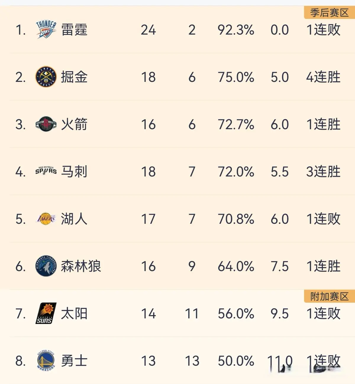 NBA西部排行榜:雷霆丢杯赛西冠,湖东谈主坐4争3,铁汉第8,快船倒第3