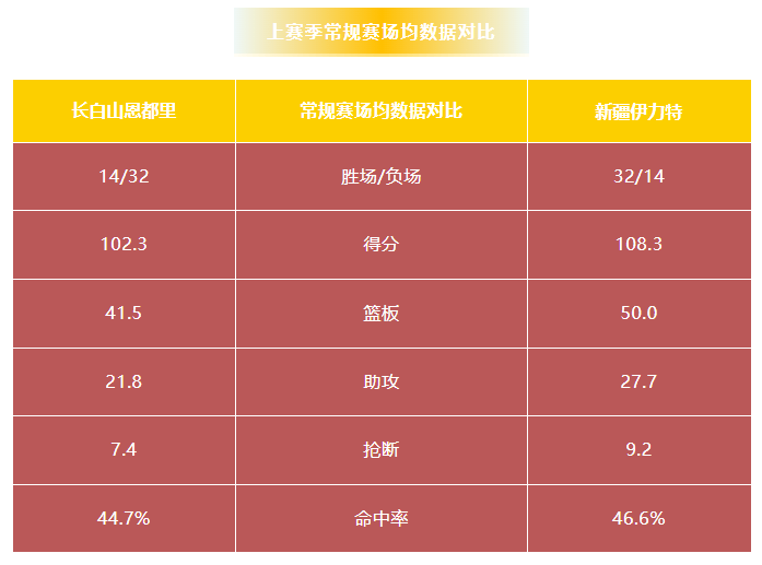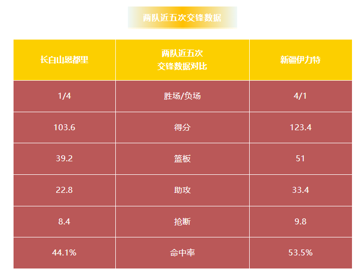 吉林男篮与新疆伊力特历史上一共交手62次,长白山恩都里19胜43负。上赛季两队交手2次,吉林男篮0胜2负。