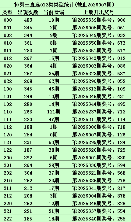 上期追想:体彩摆列三第2026007期开出奖号:126,其012路比为1:1:1,奖号012路类型为:120。