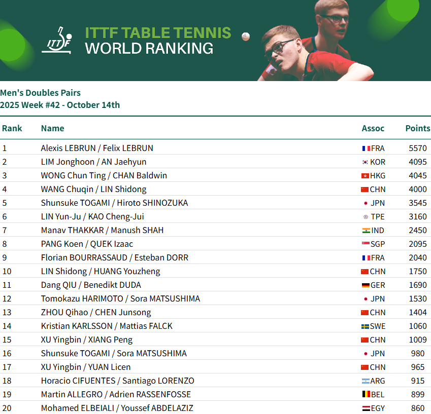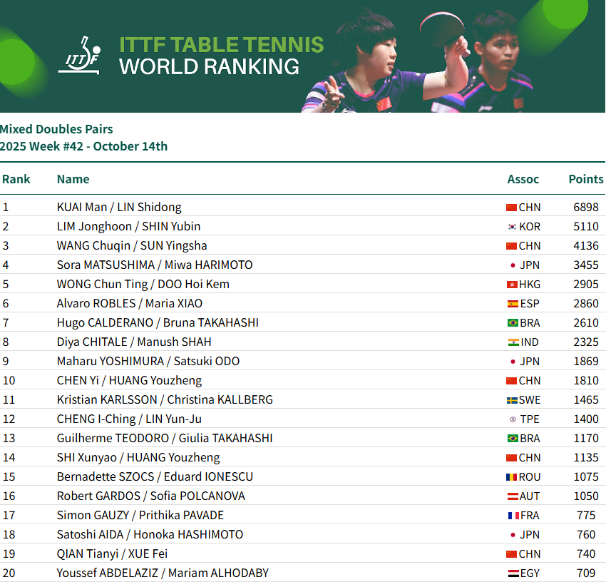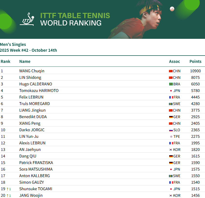 央视网音书:北京时辰10月14日,海外乒联更新了2025年第42周的宇宙排行。