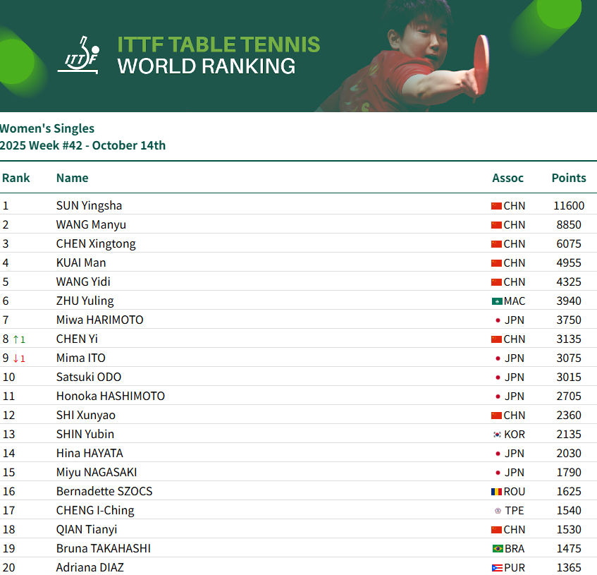女片面,中国队球员孙颖莎、王曼昱、陈幸同、蒯曼、王艺迪别离位列第1至第5,其中孙颖莎11600分流通第170周霸榜第1,陈熠位列第8。