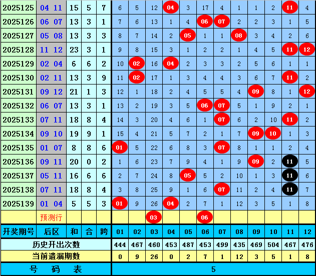 后永诀析:上期后区开出全小组合:01+04,最近10期后区奖号大小比为14:6,本期防全小组合再出,参考两码03、06。