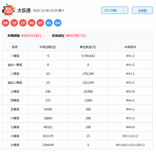 大乐透第2025139期开出奖号为08、18、22、30、35+01 04。其中前区奇偶比为1:4,三区比为1:2:2,大小比为4:1,后区为全小组合。