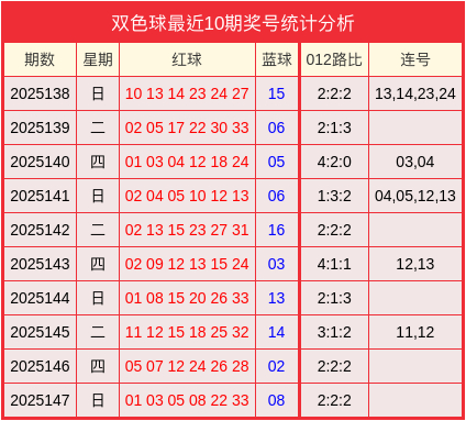开奖回归:双色球2025147开奖号码为01、03、05、08、22、33+08。其中012路比为2:2:2、无连号。