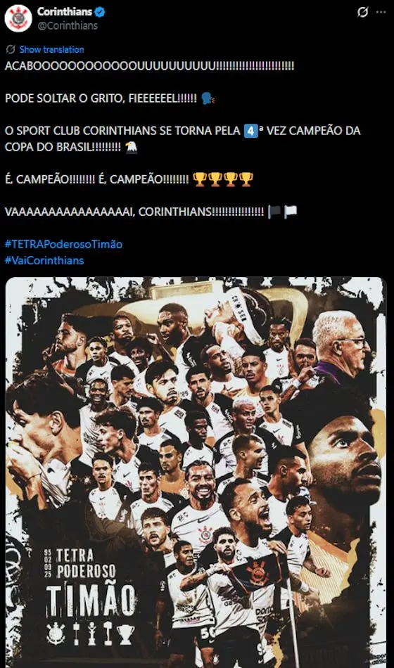 补时阶段,瓦斯科委果完成绝平。拉扬在禁区前沿突施暗箭,但门将乌戈·索萨作出寰球级扑救,透顶闹翻敌手但愿。终场哨响,科林蒂安众将跪地庆祝,横暴军团再度站上巴西杯之巅。