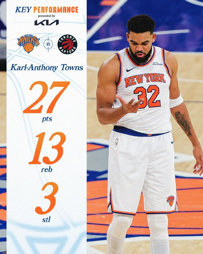 唐斯复出砍下27分13篮板指导尼克斯罢了3连败,25胜13负稳居东部第三。
