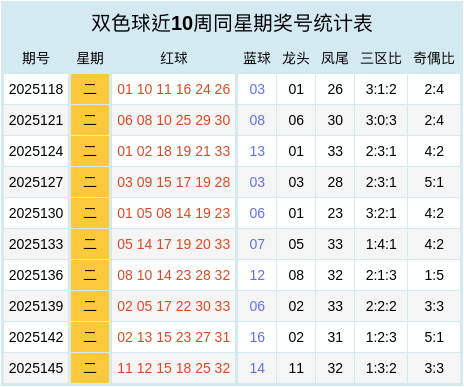 双色球近十周同星期奖号统计表